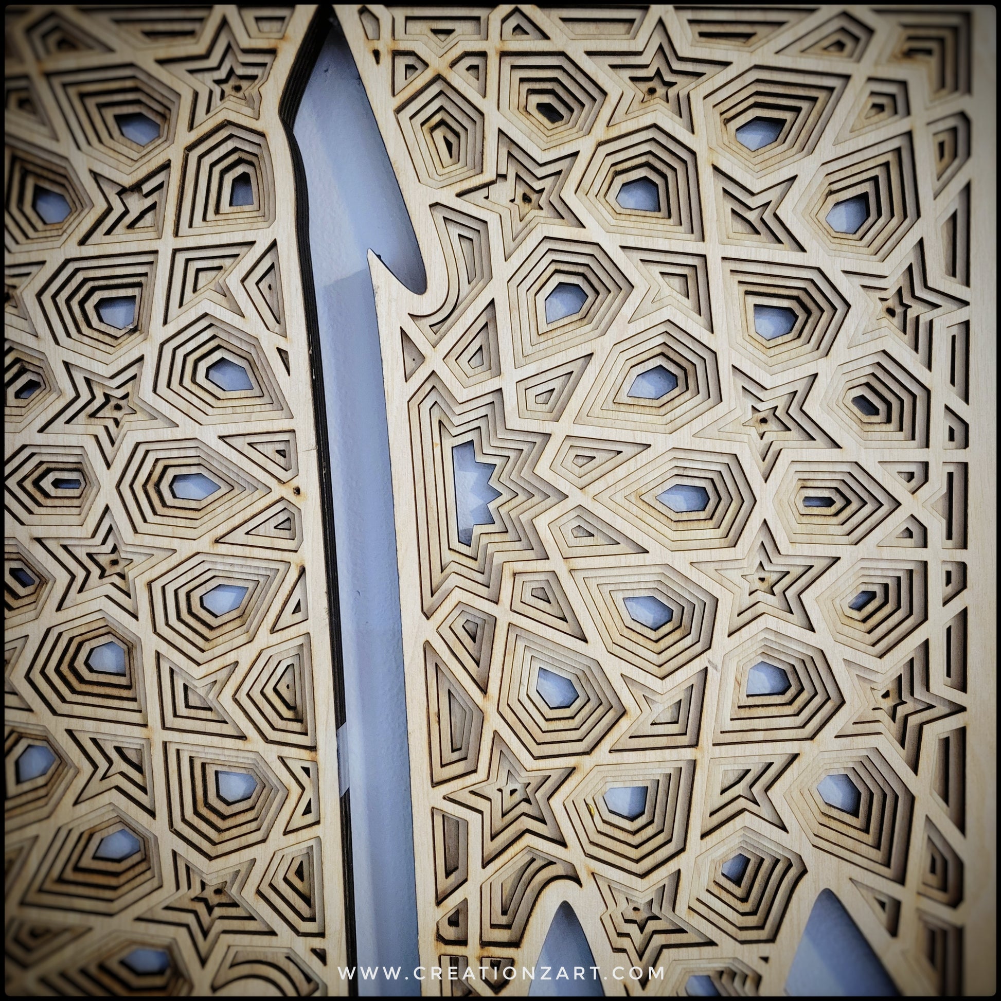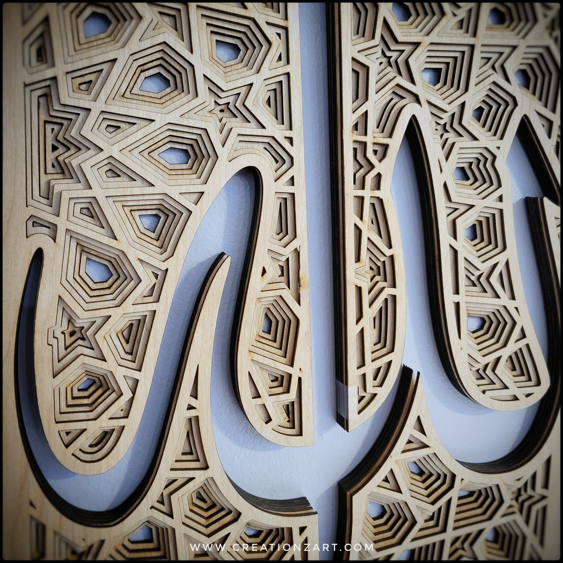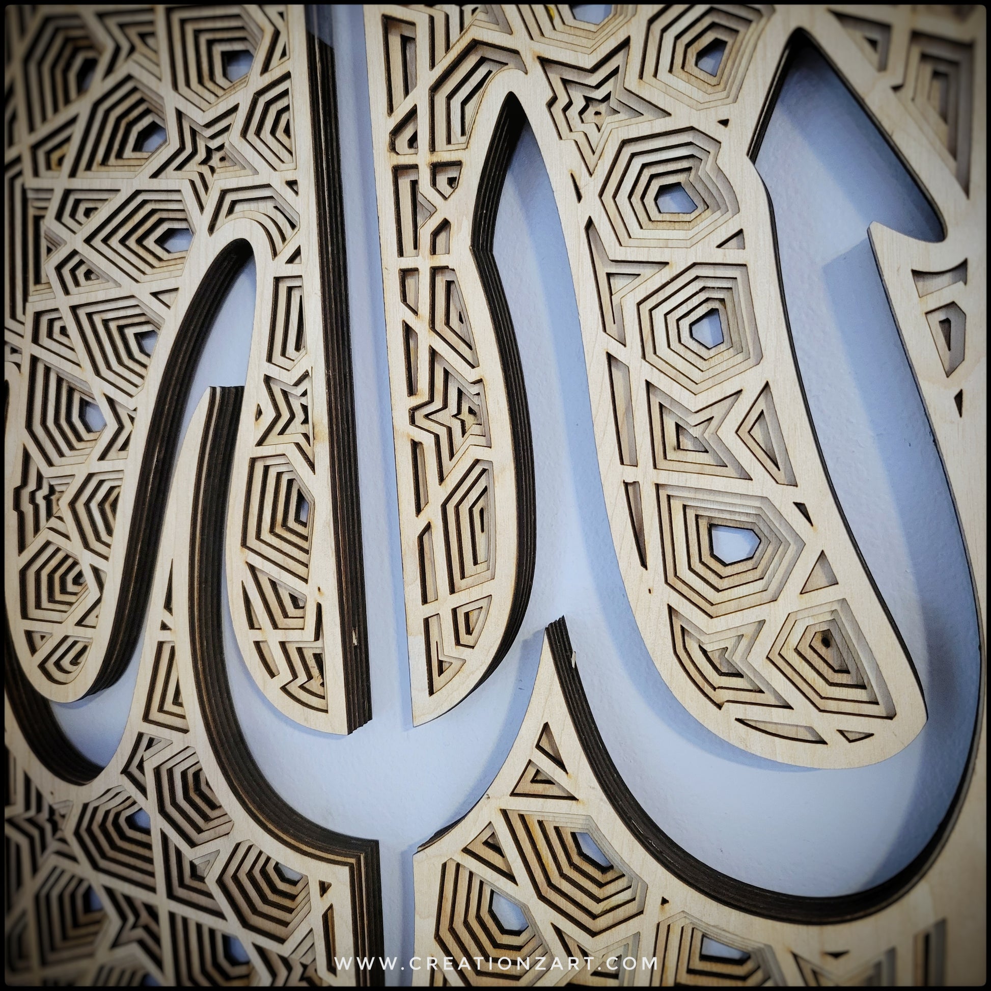 This particular piece is created with 6 layers of wood. The background is a nice geometric pattern with the word Allah written using negative space.