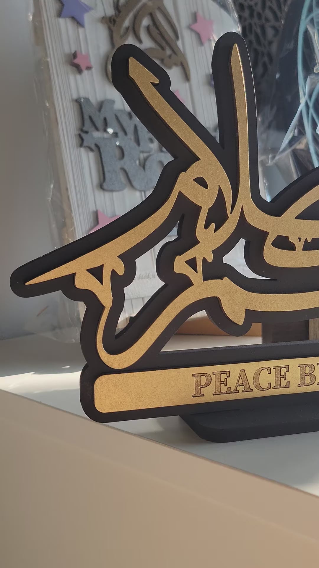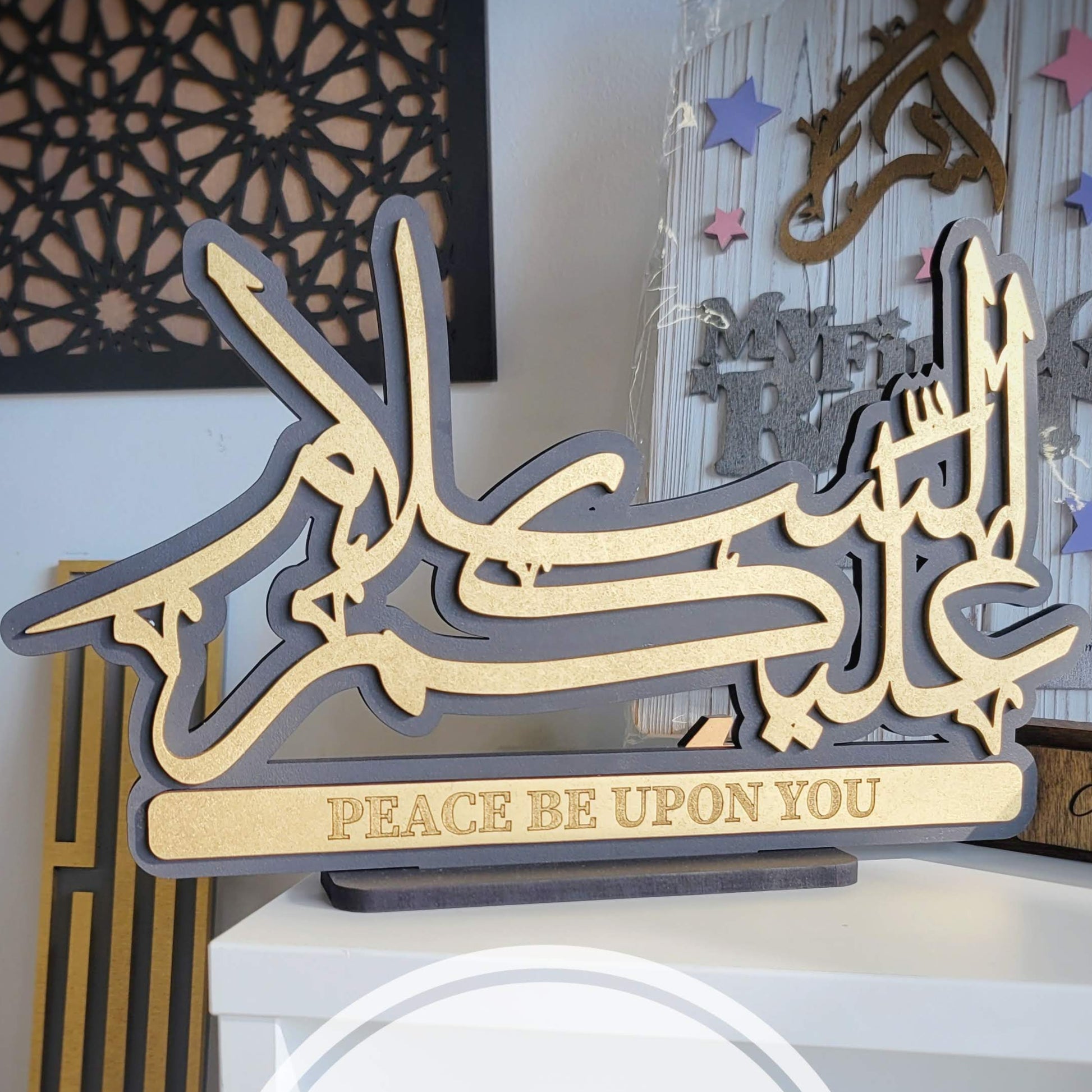 This is one-of-a-kind precisely carved two layered wood artwork. It says "Assalamualaikum" (Peace be up on you). Ideal for table top display in entry way console table. Size: ~ 6" wide x 12" high.