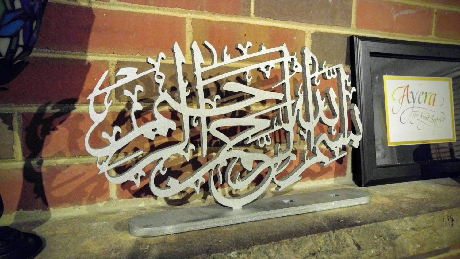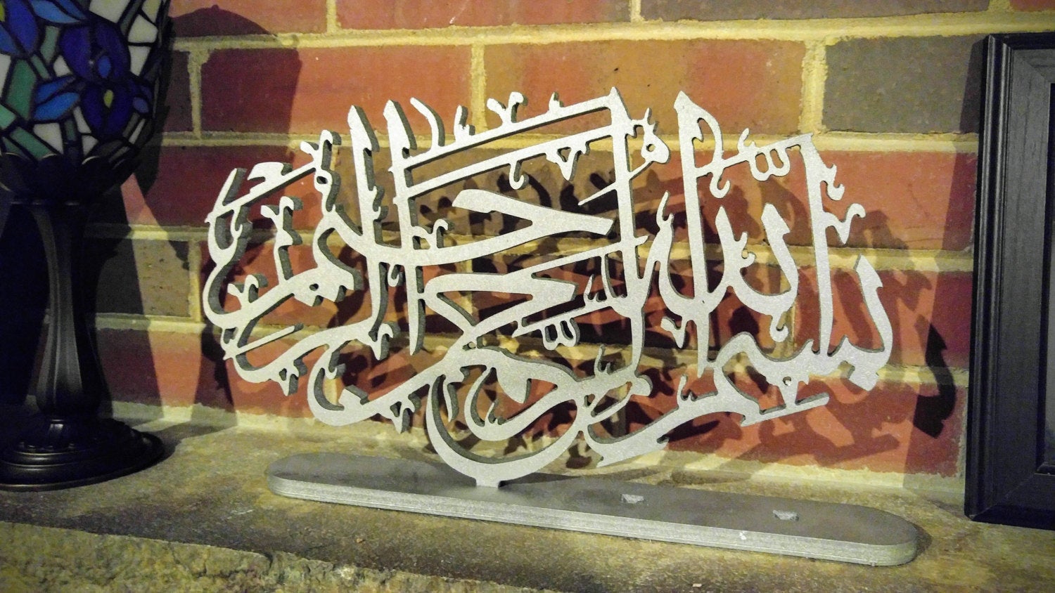 This is one-of-a-kind precisely carved wood artwork. It is pronounced as 'Bismillah Ar Rahman Ar Raheem". Ideal for table top display in entry way console table.