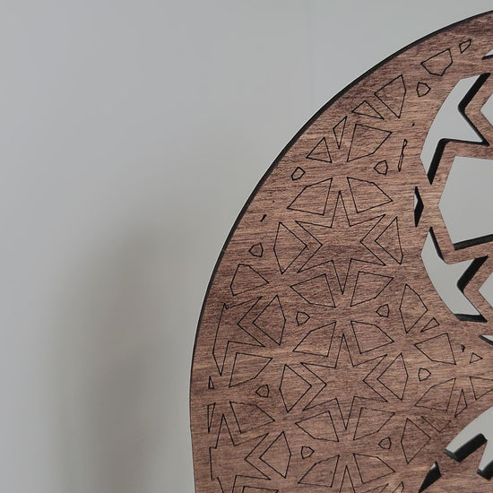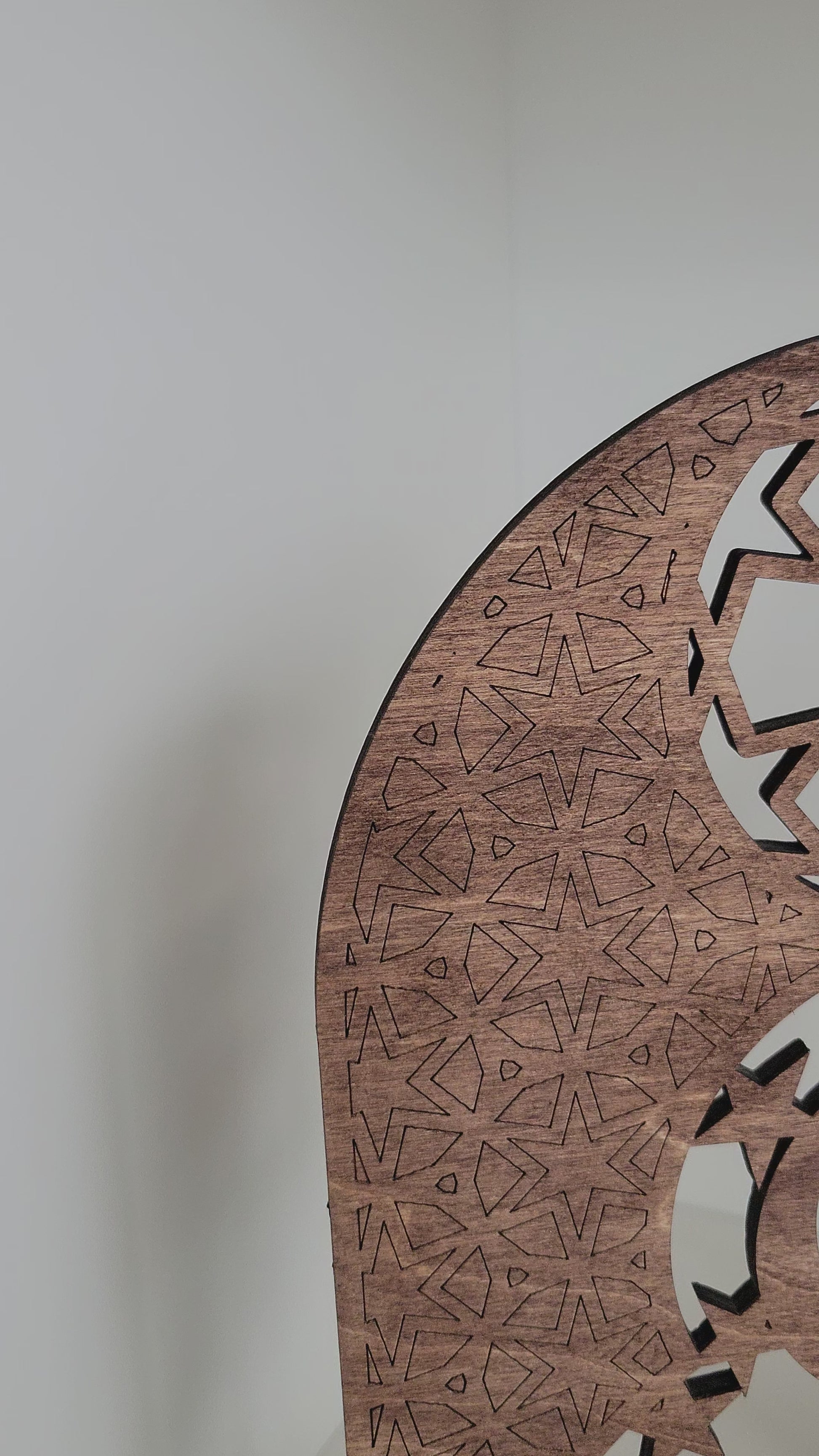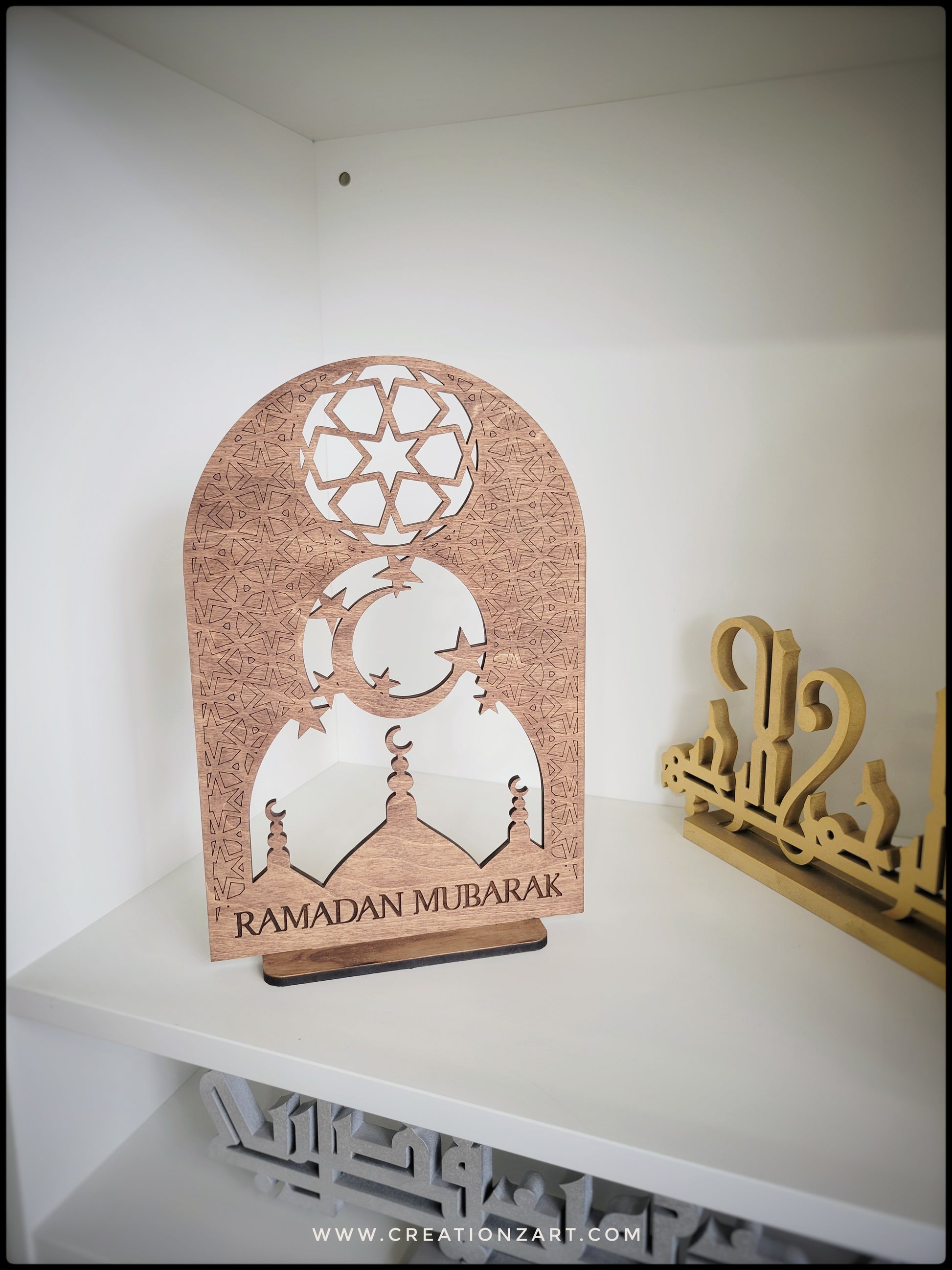 Ramadan Mubarak geometric artwork. This is a laser cut product created with extreme precision. It is ideal for Ramadan decoration, Ramadan gifts, side table displays, entryway decorations during Ramadan Parties, bookshelf decorations, and many more. Size: approx 12" high x 7" wide.