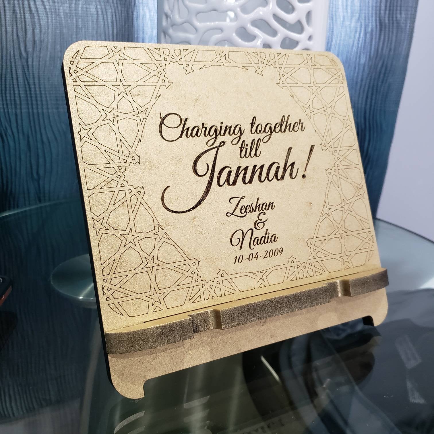 This is a customized and personalized phone holder for two phones.. ideal for a wedding or anniversary gift.