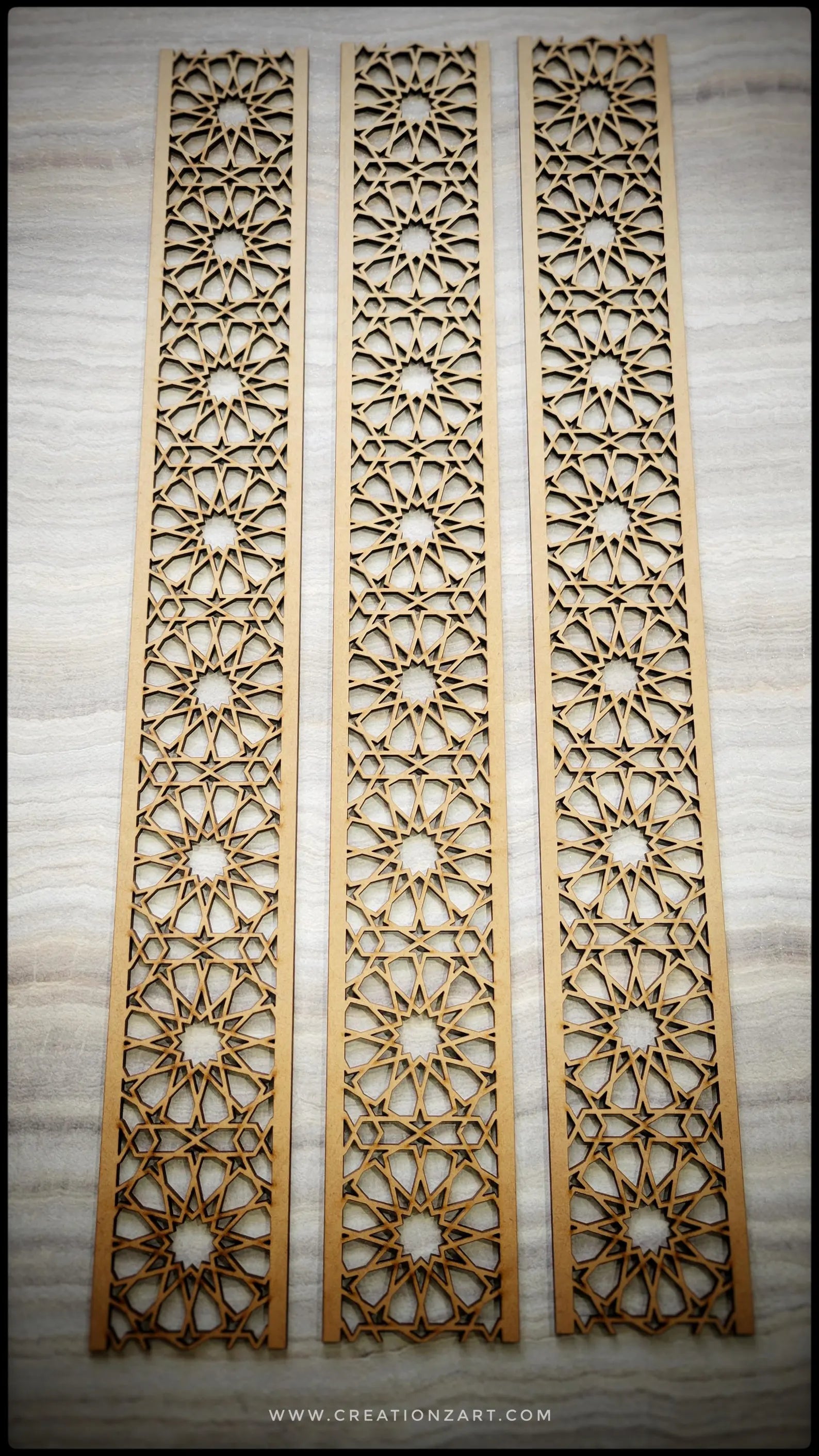 These Morrocan-themed wall trim panels will add a very elegant touch to your space. These trim panels create a seamless pattern and can be used to decorate a wainscotting project, chair rail, accent wall, ceiling, door trims, furniture or any other application.